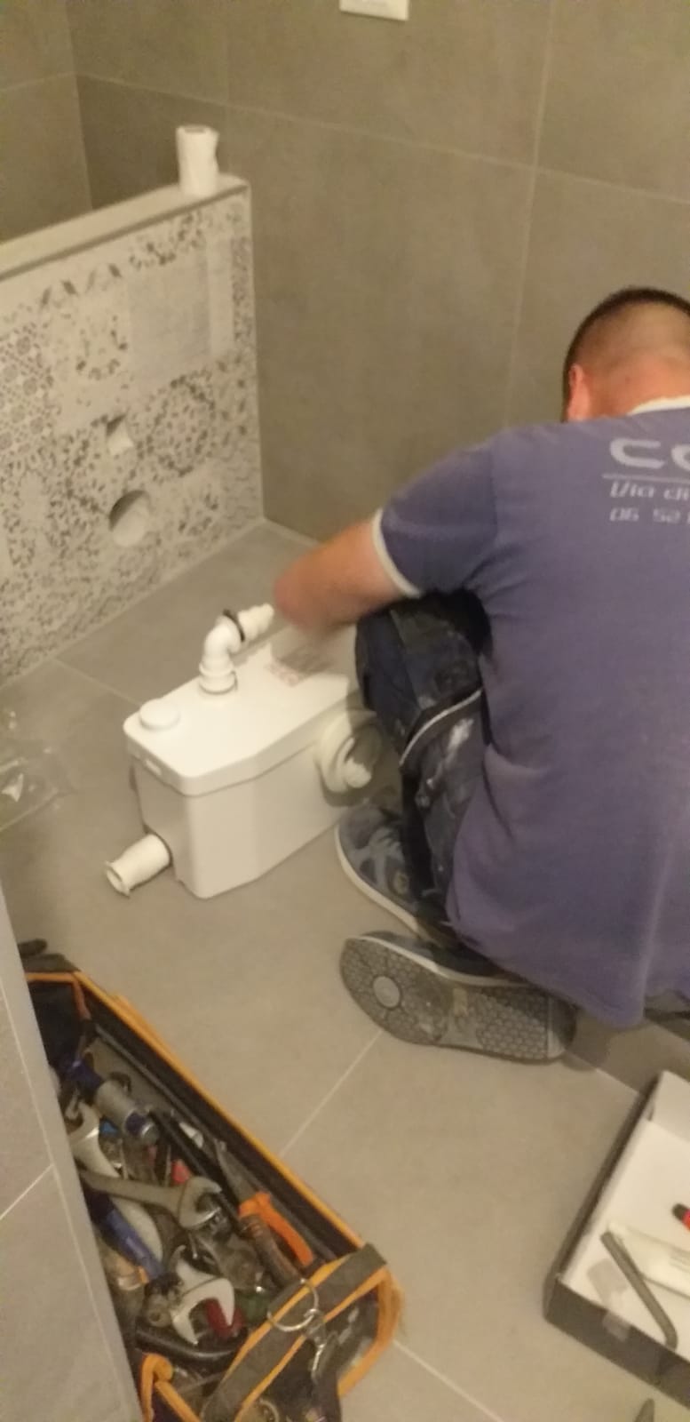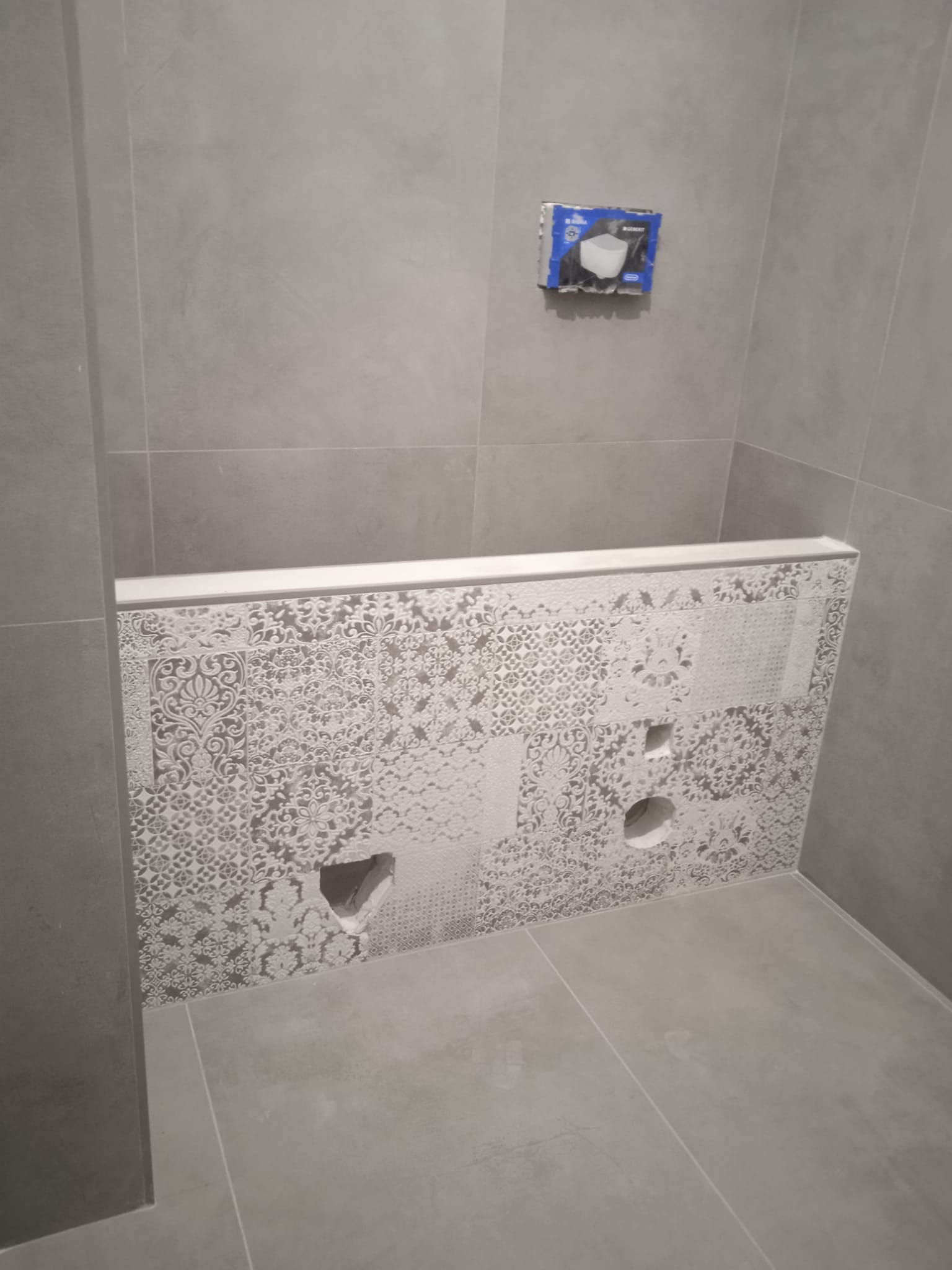 Sono stati poi realizzati dei fori passanti per innestare lo scarico del water, sulla destra e il passaggio dell'acqua, e sulla sinistra il bidet e i relativi allacci dell’acqua.