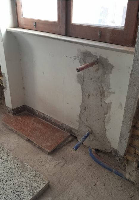 L'impianto che abbiamo trovato è il classico impianto a pioggia, con le tubazioni principali di andata e ritorno collocate in alto all'interno di tracantoni. Queste tubazioni viaggiano a ridosso del solaio per tutta la lunghezza della casa, scendendo nei punti dove poi dovranno servire i termosifoni (radianti).