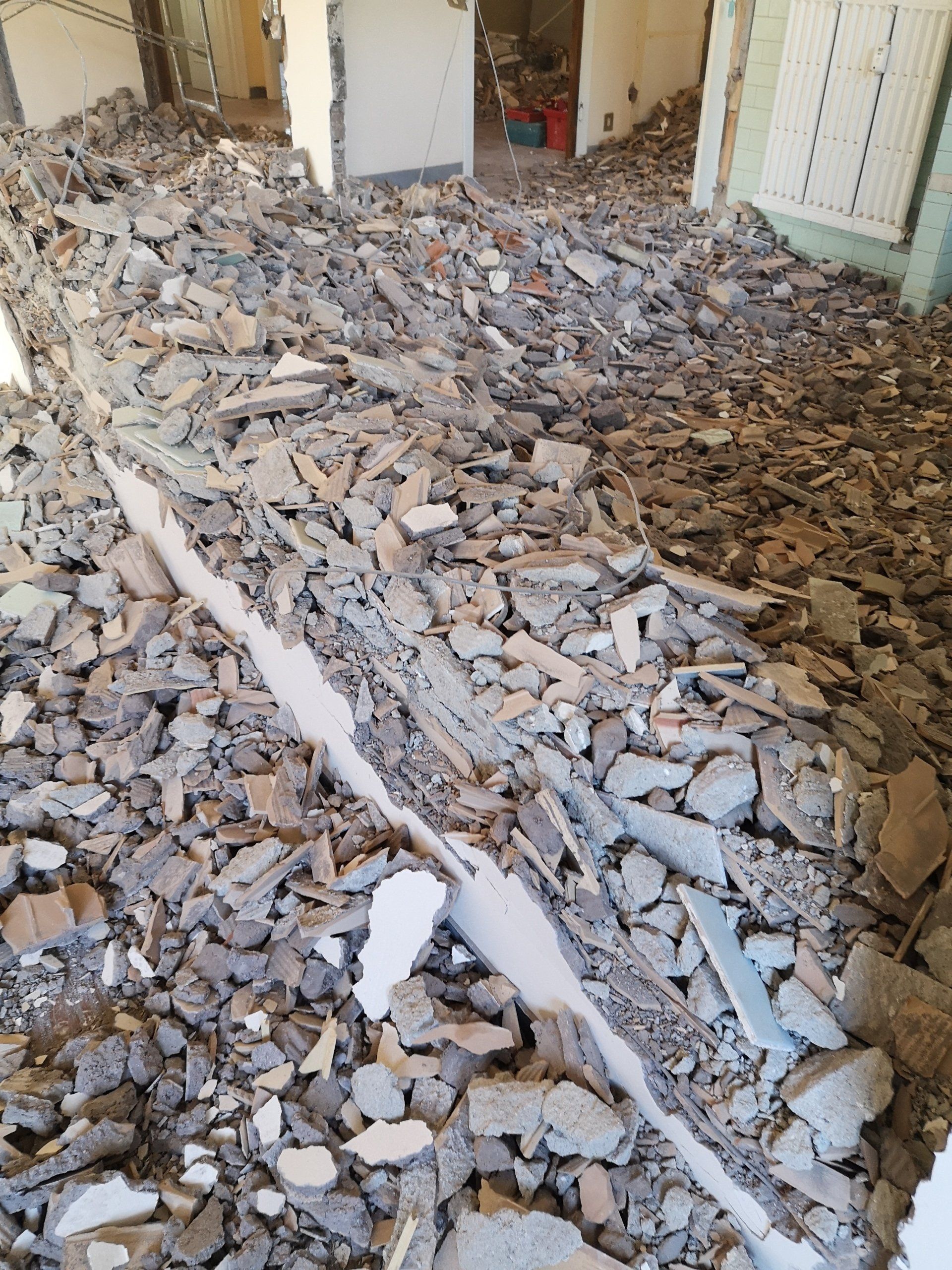 Le demolizioni possono fare riferimento ai tramezzi ai rivestimenti ai pavimenti e ai massetti, quindi è sicuramente una lavorazione impegnativa e purtroppo rumorosa, ma anche parte degli intonaci che versano già in cattive condizioni o danneggiati dalle demolizioni delle murature. Bisogna prestare attenzione a non fare entrare in cantiere nessuno (se non accompagnato dal direttore di cantiere) e muniti di relativo caschetto: sono possibili distaccamenti degli intonaci che possono creare dei danni.