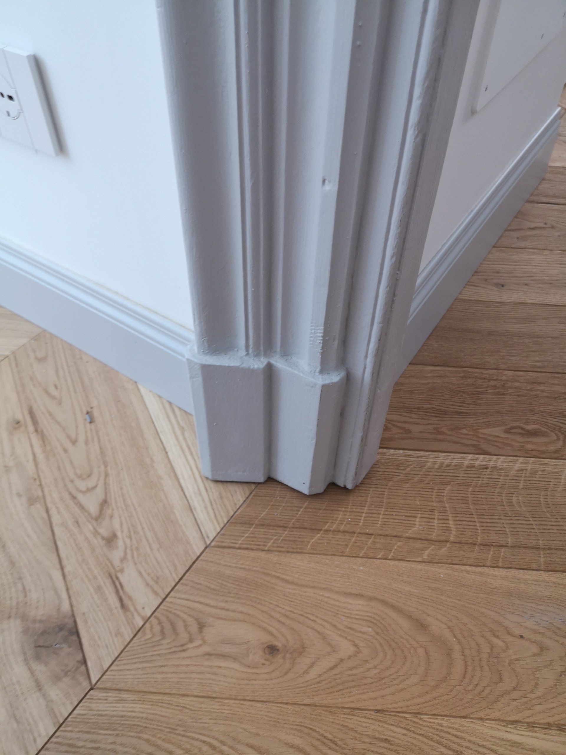 - Fornitura e posa in opera di nuovo battiscopa multistrato rivestito laccato bianco 70x10