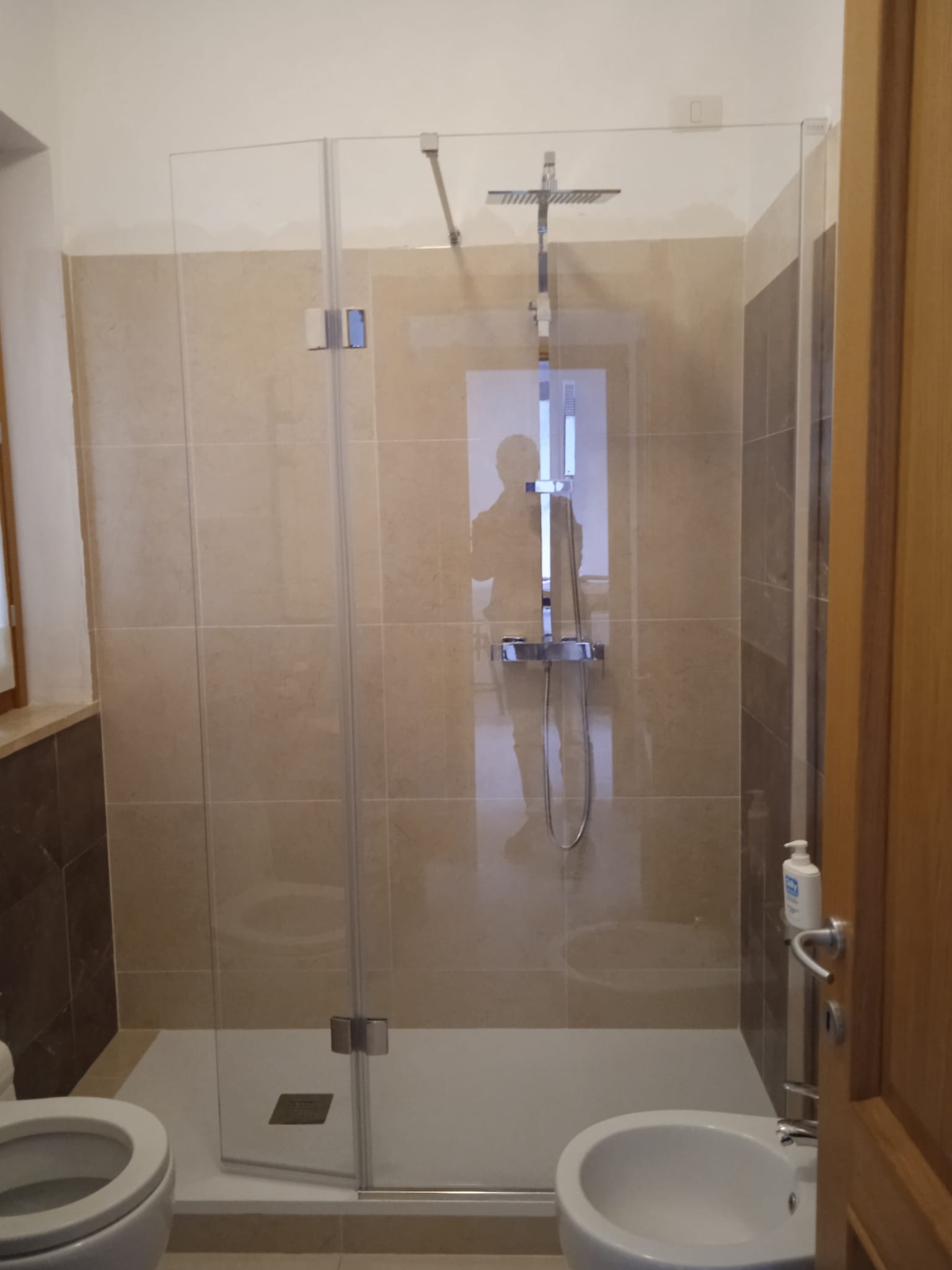 Forniture: piatto doccia AxB cm, box doccia AxB cm, piletta, miscelatore esterno, rivestimento ceramico da 40x50 cm per una parete di 2x3 m